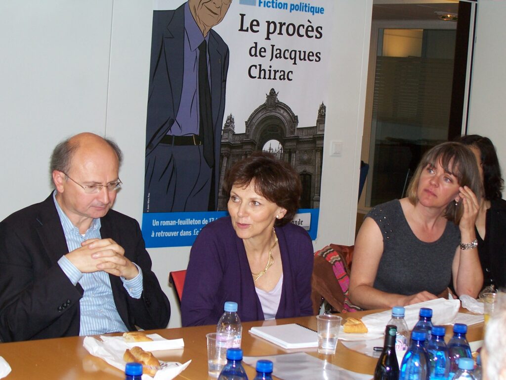 More than 20 AAPA members went to Le Monde on November 9 to meet with the group’s director, Éric Fottorino, and chief editor Sylvie Kauffmann, over an informal, bring-your-own lunch in the newspaper’s conference room. The discussion centered around the paper’s new trio of major shareholders who saved the paper from bankruptcy — Pierre Bergé, Xavier Niel and Matthieu Pigasse — and their impact or lack of it so far on the paper. We also discussed the intervention of President Sarkozy, concerned about potential new owners, with Mr. Fottorino; the Bettencourt affair and Le Monde’s lawsuit alleging violation of a law against investigating journalists’ sources. Other topics included the digital future, whether the paper considered morning publication, and how the paper makes its editorial decisions.