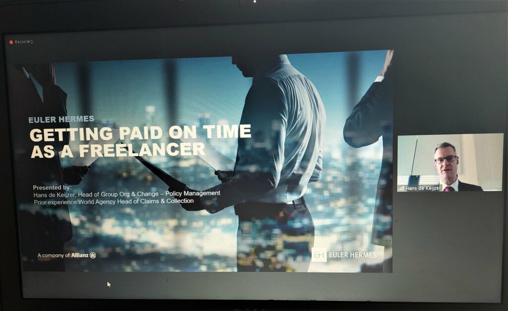 Leading the discussion were Hans de Keijzer, Group Head of Organisation & Change – Policy Management at Euler Hermes Group, and Caroline Harrap, a co-founder of the Society of Freelance Journalists, formed at the start of the Covid-19 pandemic and now counting more than 2,000 members.